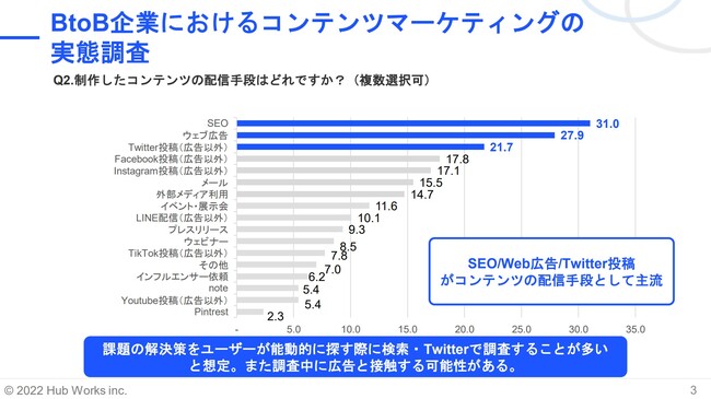「制作したコンテンツの配信手段はどれですか?」という質問に対し、「SEO31.0%・ウェブ広告27.9%・Twitter投稿21.7%」という結果になりました。BtoB企業では、ユーザーが検索手段として日頃から利用する検索エンジンとTwitter、そして検索の過程で目にするウェブ広告を主な配信手段としていると分かります。
