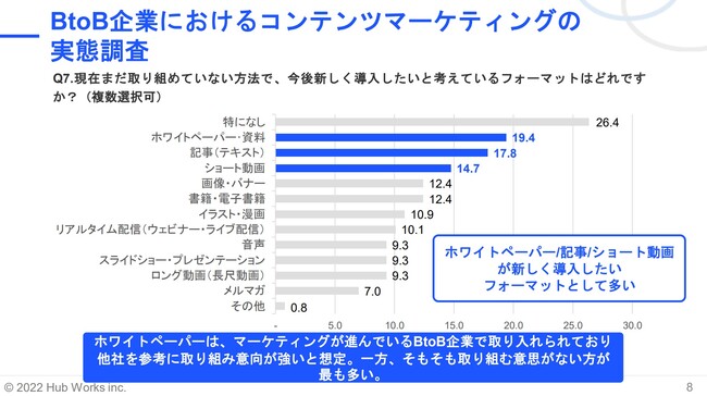 「現在まだ取り組めていない方法で、今後新しく導入したいと考えているフォーマットはどれですか?」という質問に対し、「ホワイトペーパー/19.4%・記事17.8%・ショート動画14.7%」という結果になりました。ホワイトペーパーや記事など継続的かつ大量に制作しやすいものに加え、最近普及しているショート動画も需要があると分かります。