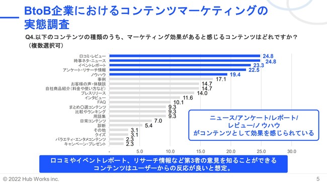「以下のコンテンツの種類のうち、マーケティング効果があると感じるコンテンツはどれですか?」という質問に対し、「口コミ24.8%・ニュース24.8%・イベントレポート23.3%・アンケート22.5%」という結果になりました。特筆すべきは第3者の意見を知ることができるコンテンツが上位を占めている点です。他者の意見を知る事ができるコンテンツはユーザー需要が高く、BtoBマーケティングにおいてもマーケティング効果が高いということが分かります。