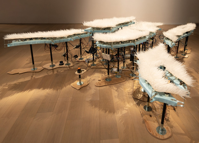 光を用いたセンシング技術であるLiDAR(ライダー)によって、鑑賞者の位置や動きを捉え、電磁石224個が作り出す磁力のフィールドと紙で作られた羽根のような表面が呼応して動く。