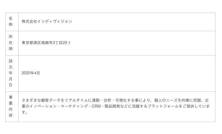 インディヴィジョンは、様々なデータをリアルタイムに連動・分析・可視化する技術・ソリューションを提供するスタートアップ企業です。企業と個人のエンゲージメントを目的として、個人の了承に基づき個人が持つ様々なニーズを的確に把握し、企業側がそれにイノベーション・マーケティング・CRM・製品開発などで応える事を目的としたプラットフォームを提供していることが強みです。また、オンライン、ハイブリッドイベントの準備から開催・データ取得・分析、CRMまでをワンストップで管理し、参加者のアクティビティデータを可視化することで「イベントDX」を実現する、欧州発のイベント管理プラットフォーム「eventory(イベントリー )」や、独自のID統合技術などにより、顧客単位でタッチポイントとタイミングを最適化するAI主導のカスタマージャーニーマップを実装した、欧州発のCDP(カスタマーデータプラットフォーム)「Relay42」の日本国内マスターリセラー権を取得しており、国際的に認められたツールの日本国内への提供・浸透に向けて活動を進めております。