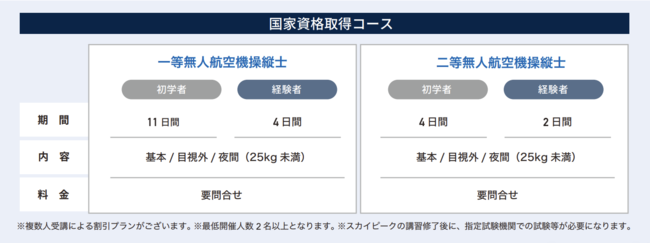 国交省航空局における「登録講習機関(T0018)」として施行日の初日より、国家資格取得に係る講習業務実施が可能な企業として登録されたことで、今後はスカイピーク社が開催する国家資格取得コースの修了審査に合格することで、指定試験機関での実地試験を免除することが可能になります。