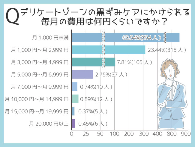デリケートゾーンの黒ずみケアにかけられる費用を調査したところ、「月1,000円未満」が63.54%(854人)となり半数以上を占めていました。