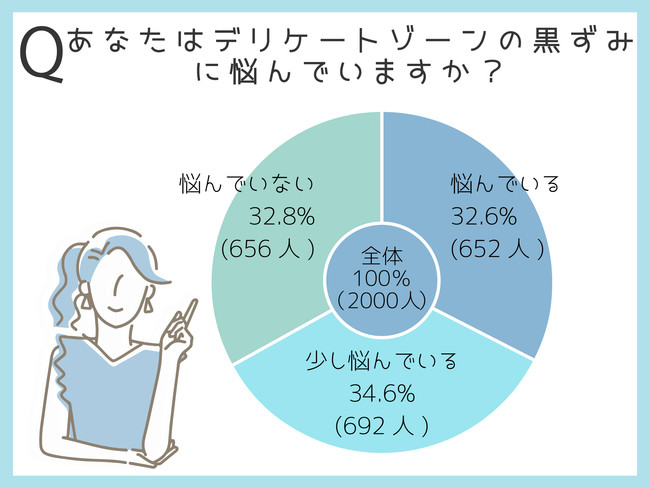 デリケートゾーンの黒ずみに「悩んでいる」「少し悩んでいる」は合計67.20%(1,344人) 。