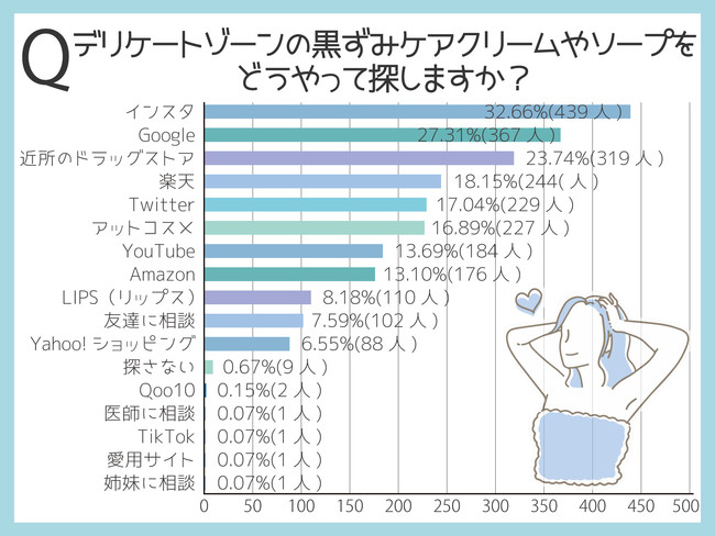黒ずみケアクリームやソープを探す手段は「インターネット」が人気で、「インスタ32.66%(439人)」が最多。