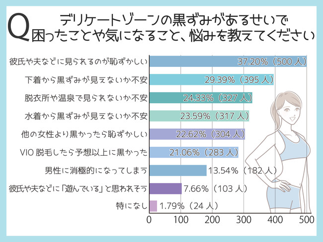 「悩んでいる」と「少し悩んでいる」の合計は67.20%(1,344人)となり、3人に2人以上がデリケートゾーンの黒ずみの悩みを抱えていることが判明。デリケートゾーンの黒ずみは普段見えない部分ですが、気になっている女性は多いようです。