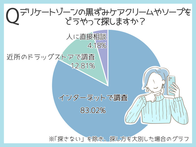 「インターネットで調査」が83.02%となり、大多数がデリケートゾーンの黒ずみケアクリームやソープをネットで調べることがわかりました。また自分一人で探す「インターネットで調査」と「近所のドラッグストアで調査」の合計は95.83%なのに対し、「人に直接相談」は4.18%という結果に。