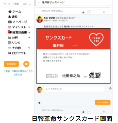 株式会社プリマベーラが開発した、独自の日報システムです。SNSアプリ感覚の日報システムで、仕事・プライベートの報告が気軽にできます。全従業員参加なので縦横斜めのコミュニケーションが可能です。報告に対してコメントや「いいね」「スタンプ」で気軽に返信できます。特に感謝を伝えたい場合には「サンクスカード」を送ることができます。直接は言いにくい感謝も、文章であれば伝えやすいので、送る側・送られる側双方が嬉しい機能となっています。