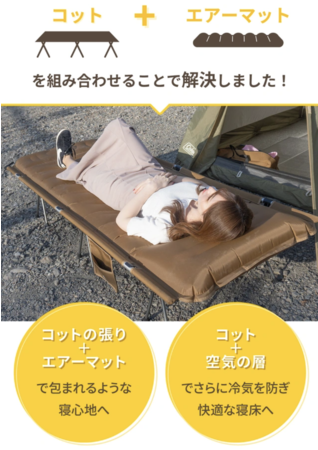 エアーマットだけでも成しえない、コットだけでも成しえない2段構造になっているからこその沈み込みで、寝転んだ瞬間にわかる心地よさを実現しました!