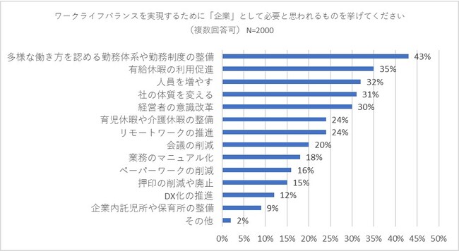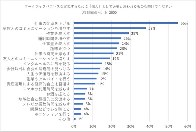 「個人」として必要と思われるものについては、「仕事の効率を上げる」が55パーセントで最多となりました。その他では「家族とのコミュニケーションを増やす」(38パーセント)、「残業を減らす」(29パーセント)、「睡眠時間を増やす」(25パーセント)、「仕事量を減らす」(24パーセント)、「趣味を持つ」(23パーセント)などが多くの回答を集めました。
