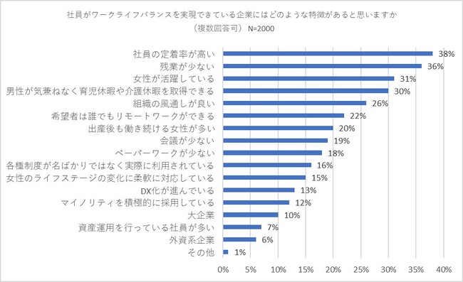 社員がワークライフバランスを実現できている企業に対するイメージについても質問しました。「社員の定着率が高い」が38パーセントで最多の回答を集めました。2位にほぼ同じ割合で「残業が少ない」(36パーセント)が入ったほか、「女性が活躍している」(31パーセント)、「男性が気兼ねなく育児休暇や介護休暇を取得できる」(30パーセント)などの回答が続きました。