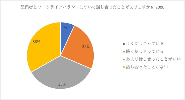 最後にワークライフバランスに関する夫婦間のコミュニケーションに関して尋ねました。「あまり話し合ったことがない」(35パーセント)と「話し合ったことがない」(33パーセント)との回答がほぼ同じ割合で1位と2位になりました。「時々話し合っている」は25パーセント、「よく話し合っている」は7パーセントにとどまる結果となり、約7割の方はワークライフバランスに関して夫婦間のコミュニケーションがうまく取れていないことが明らかになりました。