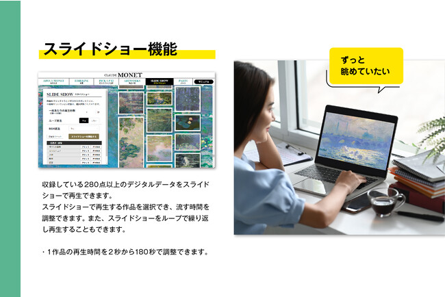 代表作「睡蓮」をはじめ「散歩、日傘をさす女」「印象・日の出」など、総数280点以上の作品データをスライドショー形式で再生することができます。