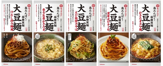 「キッコーマン 大豆麺」シリーズは、「大豆麺」(乾麺)と専用のスープやソースをセットにした“新しい主食”です。1袋1人前入りで、小鍋やフライパン、電子レンジなどで簡単に調理できます。麺は、大豆を50%配合した高たんぱく・低糖質な麺です。※麺には小麦も使用しています