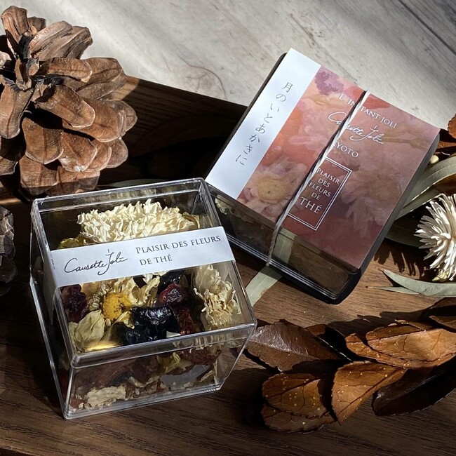 京都店では四季折々の自然の風景や移ろいを感じていただきたい想いから、「茶花」のお花のお茶もご提供しております。お茶の商品名は「枕草子」より抜粋してつけております。清少納言が自然や、宮中での出来事などさまざまな事を独自の視点で書き綴った歌は今も昔も変わらぬ人の思いや感性を感じることができ、ぜひこの京都でそんな感性もお茶とともに味わっていただきたいと思います。