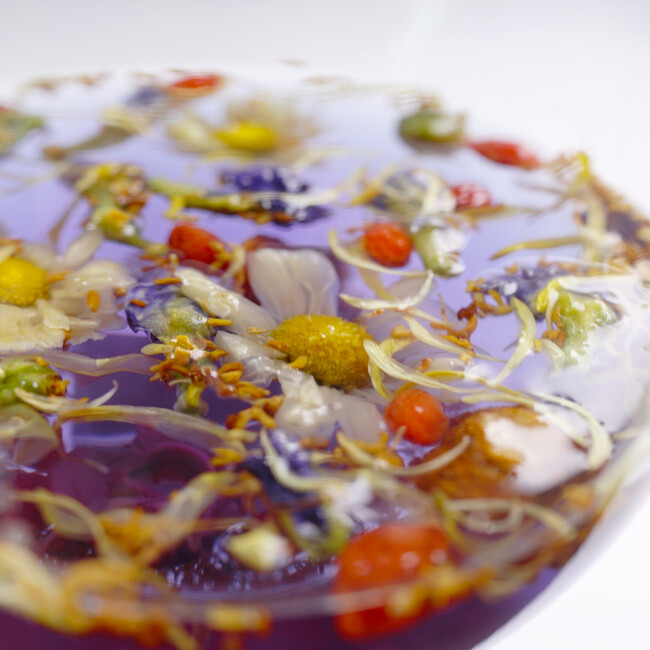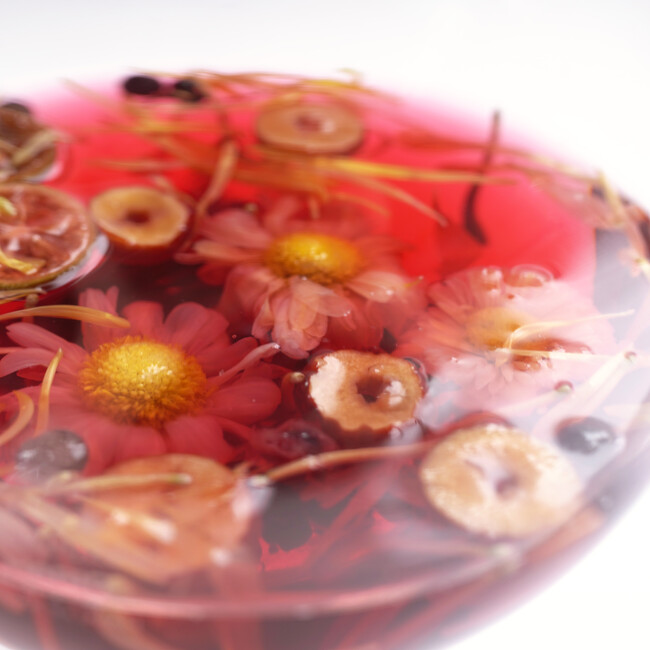 ブルーベリーにはビタミンEが多く含まれており、クランベリーは抗酸化作用をもつポリフェノールやビタミン類が豊富です。他にも皮膚・粘膜・目の健康に良いビタミンAを多く含む菊類のお花などを合わせました。