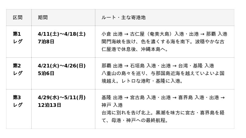 特定非営利活動法人ゼリ・ジャパン(所在地:神戸市、代表:更家悠介)が運営する「帆船 BLUE OCEAN みらいへ」は、2026年4月11日から5月11日にかけて、北九州市・小倉港を出発し、奄美大島、沖縄本島、宮古島、石垣島を経て、台湾・基隆(キールン)まで往復する長期セイルトレーニング航海を実施いたします。