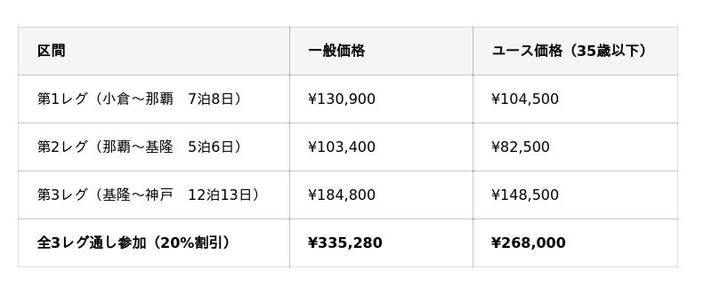 ※ 複数レグ参加;2レグ参加は15%、3レグ参加は20%割引。