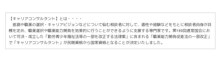 日本産業カウンセラー協会では、非正規雇用労働者や転職希望者・経験者の増加とともに、その役割の重要性がますます高まってきている「キャリアコンサルタント」の国家資格化にともない、新たに「JAICOの国家資格キャリアコンサルタント養成講習」を4月1日より開講することとし、1月29日(一部会場は2月1日)より専用ホームページにおいて、受講者の募集を開始致します。(1月29日現在、厚生労働省へ認定申請中)