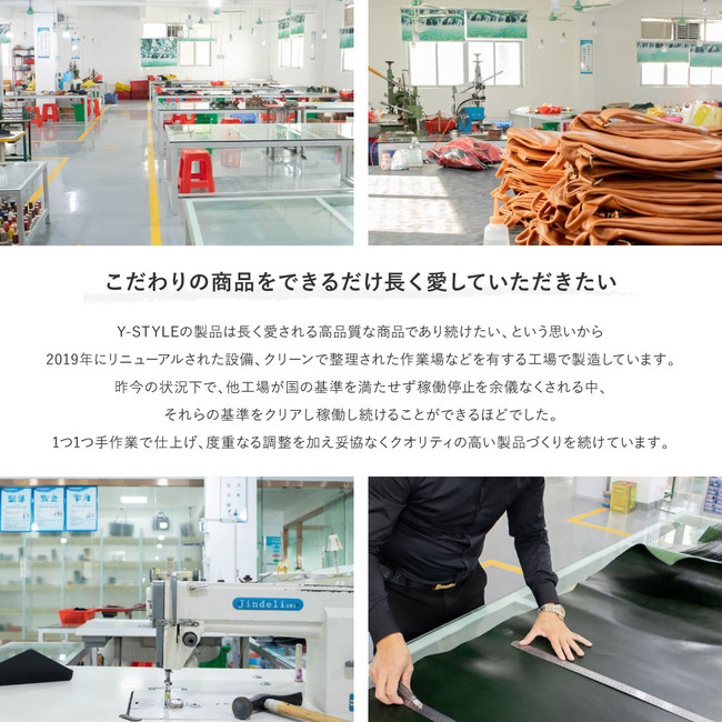 Y-STYLEの商品は長く愛される高品質な商品でありたいという強い想いから、2019年にリニューアルされた設備、クリーンで整理された作業場等を有する工場で製造しています。1つ1つ手作業で仕上げ、度重なる調整を加え妥協のないクオリティを追求しています。