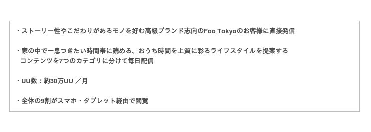 当社ではFoo Tokyoのブランドを紹介するコンテンツではなく、あくまでもFoo Tokyoのお客様が実現したいライフスタイルに寄り添ってコンテンツを配信しており、メディア単体で成立するように設計しております。その中で、Foo Tokyoのお客様とターゲットが重なっているブランド企業様の純広告やタイアップ広告は読者の皆様にとっても有益な情報であると判断し、広告商品の販売を開始いたしました。