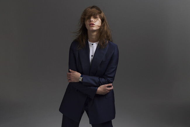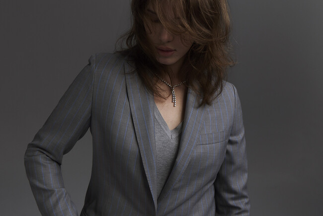 ダブルブレストのジャケットはラペル(衿)幅がワイドでエレガントな印象に。
