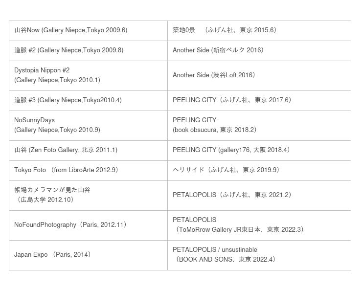 かつて肉体労働者の街と呼ばれた東京都台東区にある「山谷地区」を撮影するために、約7年間簡易宿泊所の管理人とし て撮影。 その後築地市場を撮る為に、市場を担当する警備会社に就職、その後も常に内側からの視線によって変わりゆく街・都市 風景を捉えてきた。