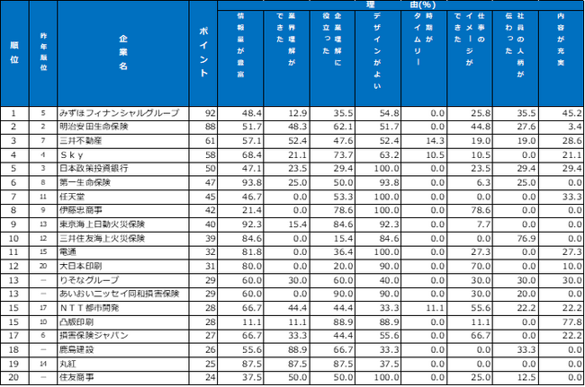 1位のみずほフィナンシャルグループは「デザイン」と「情報量」のポイントが高いほか「電子書籍で読めるのが便利」といった利便性に関するコメントも目立ちました。2位の明治安田生命保険は「全体的にわかりやすく、仕事のイメージができた」と「企業理解」で、3位の三井不動産は「プロジェクトの写真と社員のお話で業界理解が深まった」、と「業界理解」でも評価されています。