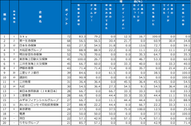 2年連続1位のSkyはInstagramや、X(旧Twitter)、YouTube、TikTokなど学生になじみの深いメディアで積極的に情報を発信。2位の第一生命保険もInstagramを活用しておりSNSを通じた採用広報が好評です。「情報量が適切」「時期がタイムリー」「何度も届いた」に支持が集まりました。3位の日本生命保険は「優しい言葉選びが印象に残った」と「読みやすい内容」でも評価を集めています。