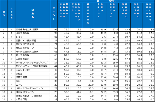 上位にランクインした企業は共通して「内容が充実」「業界理解」「企業理解」で高く評価されています。1位の東京海上日動火災保険は「毎回異なる社員が登場し、様々なことを聞くことができた」「この会社に入るか否か関係なく、これから社会人になる上で参考になる情報が詰まっていた」との声が聞かれました。2位の明治安田生命保険はウェブセミナーを複数テーマで開催。先輩職員が登場する座談会や、採用担当者による選考ポイント解説なども好評です。
