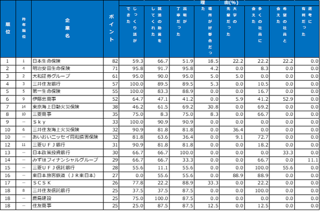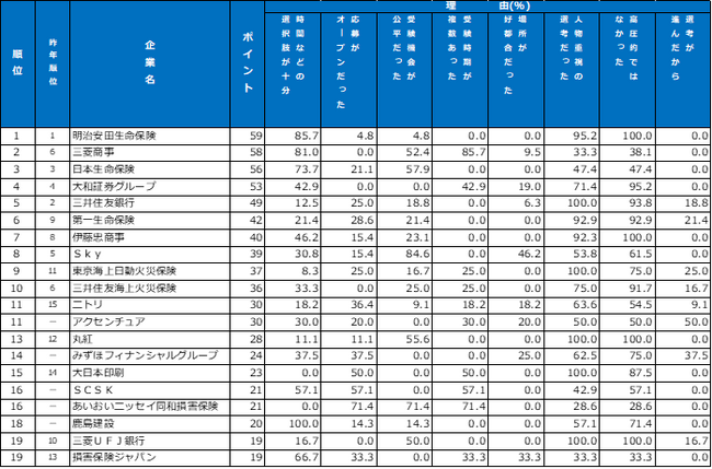 1位の明治安田生命保険は「良いところを引き出してくれようとしていると感じた。リラックスして面接に臨めた」と「高圧的ではなかった」「人物重視の選考」で評価されています。2位の三菱商事は学生の事情が多様化していることを踏まえ、従来の6月に加えて春休み期間の3月にも面接を実施。学生事情に応じた就活時期の選択肢を提示し「時間などの選択肢が十分」「受験時期が複数あった」でも支持を集めています。