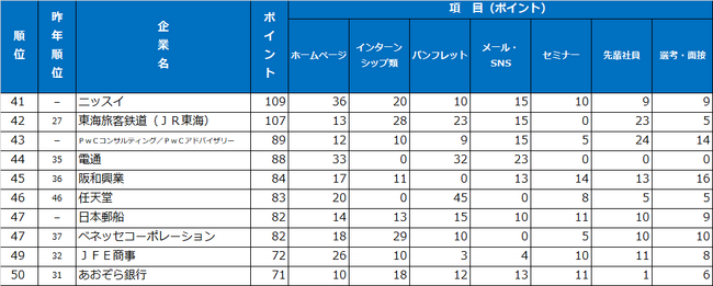 『新卒採用力ランキング』調査では、企業の採用広報、選考活動を(1)ホームページ (2)インターンシップ類 (3)パンフレット・入社案内 (4)メール・SNS (5)セミナー・説明会 (6)先輩社員・懇談会 (7)選考・面接 の7つの分野ごとに学生の評価を聞いています。そして、各分野のポイント合計を企業の「新卒採用力」と定義し、総合ランキングを出しています。