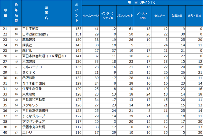 ウェブやパンフレットなど多くの学生に向けた広報では豊富な「情報量」と「デザイン性」が、インターンシップ類では「複数の開催時期や応募機会」、「仕事理解」や「業界理解」に支持が集まりました。また、個別の接点となるセミナーや先輩社員・懇談会、選考・面接では、「丁寧な対応」と「人物重視の姿勢」が評価されています。