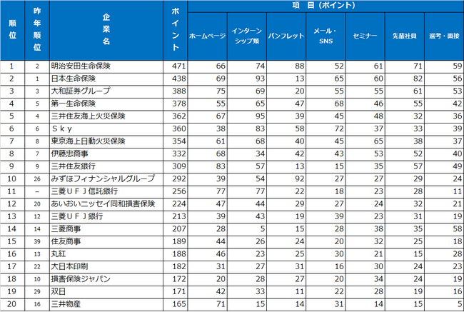 初の総合1位となった明治安田生命保険は、選考・面接部門で1位となったほか、パンフレット・入社案内、セミナー・説明会、先輩社員・懇談会の3部門で2位、インターンシップ類、メール・SNS部門で5位とバランスよく学生の支持を集めました。2位の日本生命保険も先輩社員・懇談会部門で1位となったほか、インターンシップ類部門で2位、メール・SNS、セミナー・説明会部門、選考・面接部門で3位にランクイン。3位の大和証券グループもホームページ、先輩社員・懇談会部門で3位、メール・SNS部門、選考・面接部門で4位と就職活動全般を通して複数の部門で学生の評価を集めた企業が上位にランクインしました。