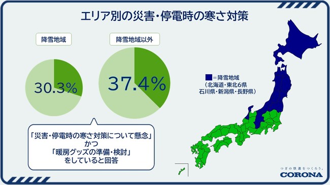 その結果、「寒さ対策について懸念している」と答えた人の中で、「暖房グッズを準備済み、または購入を検討」している割合は、降雪地域では30.3%、それ以外の地域では37.4%となり、降雪地域以外の方が災害・停電時の寒さ対策への意識が高いことが明らかになりました。