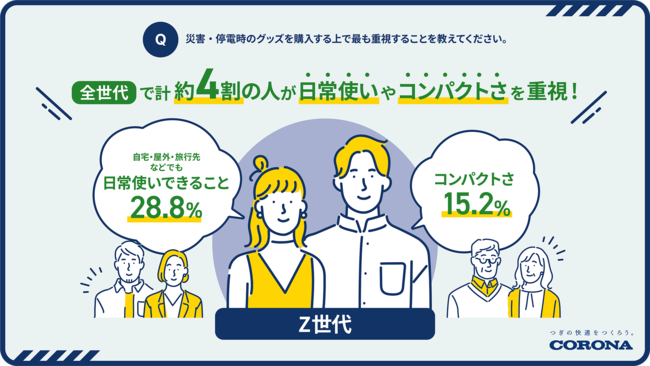 災害・停電時グッズを購入する上で最も重視するポイントを調査したところ、全体では約4割以上の人が災害・停電時グッズを選ぶ際に、日常使いできることやコンパクトさを重視していることが明らかになりました。