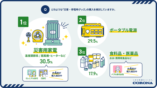 次に、災害・停電時グッズについて、どのようなものの購入を検討しているかを質問したところ、災害用家電(温度調節系/扇風機・ヒーターなど)が最も多い30.5%、2位はそれらの家電や連絡手段として必須なスマートフォンの充電などにも活用できるポータブル電源で29.5%、3位は食料品・医薬品で17.9%という結果になりました。