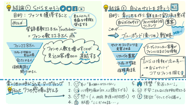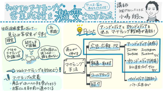 これまで参加した数あるセミナーの中で、最も学びのある内容でした。本当にありがとうございます。私の悩みは答えに変わりました。 会社(マネージャー)の方針・指導・考え方に違和感を持ち続けて同じことを考えておりました。 見込み客がいる商談が始まる場面からのセールスプロセスに注力しており、肝心のマーケティングは何も教わることがない。 にも関わらず、見込み客発見が仕事の8割、毎週アポ5件入れれば成功するなどと毎週のミーティングで詰めてくる。 同じように、「では、毎週見込み客を探す方法はどうすれば良いですか?=マーケティングの方法を教えてください」と聞いたところ、「リストアップからTelアポだよ!」「その辺の人に声かけたり、飛び込みだよ!」「既契約に紹介依頼してきなよ」 …このWeb時代に時代錯誤すぎると感じました。 なので、つい最近になってWebマーケティングを始めることにしました。 そんな折、こちらのセミナーに参加させて頂いて、保険営業ご経験者がWebマーケティングの重要性を力説されていたので、大変有意義な学びを得ることができました。 改めて、本当にありがとうございました。