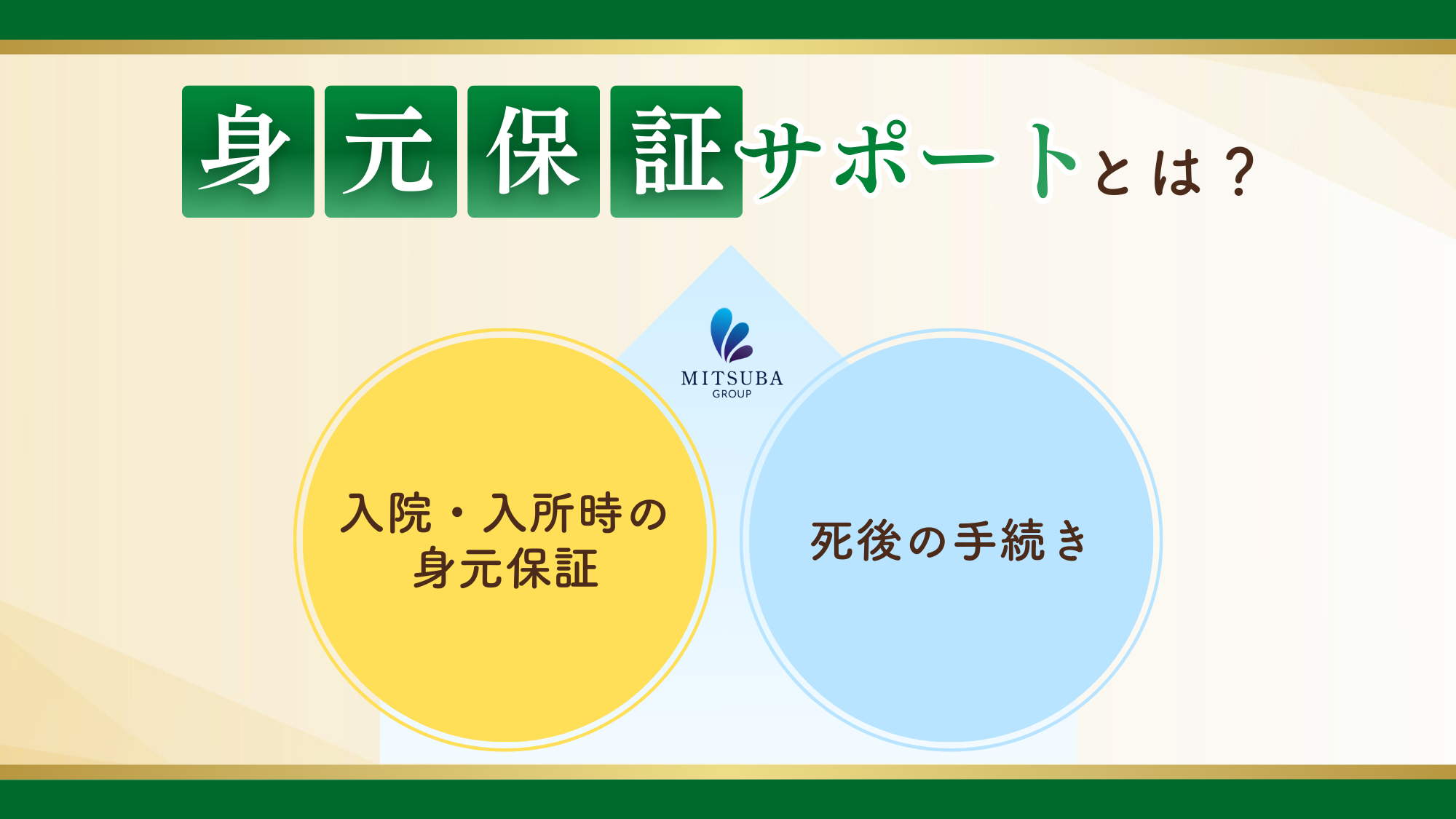 みつ葉グループの「身元保証サポート」は、ご家族に代わって、入院や施設入居、死後の事務手続きなど、人生の重要な場面での支援を行います。
