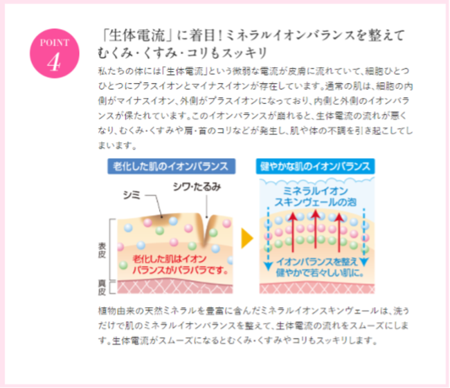 ミネラルイオンスキンヴェールは生体電流に着目をしています。人間の身体にはプラスイオンとマイナスイオンが存在し、これらのイオンバランスが保たれることでお肌本来の働きが促されます。健やかで若々しい肌が保たれるだけでなく、くすみやむくみなどもスッキリするので身体の不調も整い始めます。
