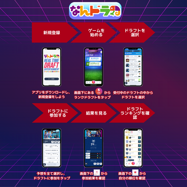 「なんドラ」はアプリケーションを利用し試合の勝敗や特定選手の活躍などを予想するサービスです。 予想結果に応じてポイントを獲得でき、週間ランキング上位ユーザーには様々なギフトをプレゼントしており、全国にいる利用者とランキング勝負を通してスポーツ観戦に新たな観戦価値と熱狂を提供します。