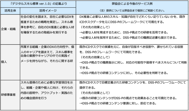 その活用イメージにおいて、DSS-PとiCDタスクの関連性を整理したことにより、弊協会では次のようなサービスが可能と判断しております。今後、順次対応して参りますので、ご期待ください。