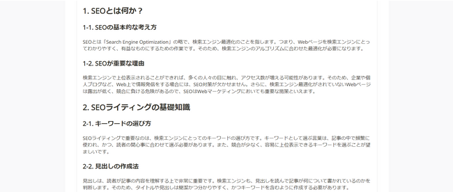 記事の構成を選択後、記事構成に沿った記事が生成されます。AI Writerが生成する記事は、完璧な記事というわけではないので、手直しが必要となります。