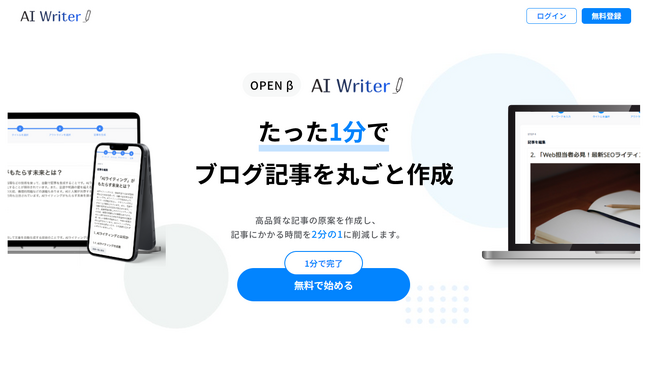 AI Writerは、たった1分で丸ごとブログ記事を作成できるサービスです。 記事作成にかかる時間を削減し、ライティングの負担を減らすことで、よりクリエイティブな重要な仕事に費やすことができます。 ■対象ユーザー ・記事コンテンツの制作を仕事にされている「Webライター」の方 ・ブログを効率的に運用していきたい「個人ブロガー」の方 ・SEOのパフォーマンスを上げたい「企業のSEO担当者」の方 ■サービスの特徴 1.記事作成時間を2分の1に削減 AI Writerは、自動化された文章生成機能を持ち、記事作成にかかる時間を従来の半分以下に短縮することができます。 2.最新のAI技術「ChatGPT」を搭載 AI Writerは、ChatGPTのAPIを利用して文章を生成しているので、人間味のある高品質な記事を生成することが可能になります。 3.5000文字を超える記事も作成可能 AI Writerは、1回の生成で5000文字以上の記事を作成することが可能です。 ■制作事例 過去にAIが生成した記事をいくつかご紹介します。 ・初心者でも大丈夫!WordPress の使い方完全ガイド(6112文字) https://ai-writer.notion.site/WordPress-82133289a9f04e5b99cd83090f048fe7 ・AIが生み出す驚くべきライティング手法とは?(3002文字) https://ai-writer.notion.site/AI-2594fa3d721d4fa09dc1e882e5bd6e87