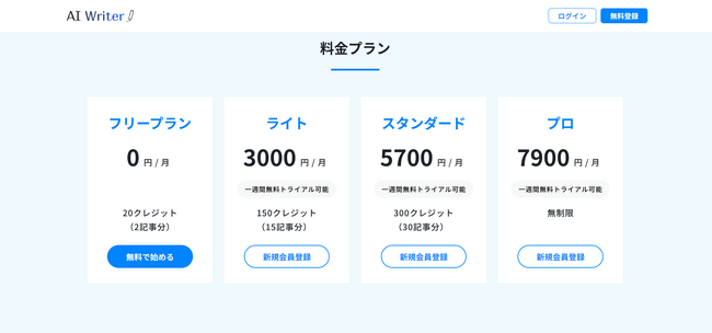 各プランの特徴について ・フリー:毎月20クレジット付与(2記事分) ・ライト:毎月150クレジット付与(15記事分) ・スタンダード:毎月300クレジット付与(30記事分) ・プロ:クレジット無制限 クレジットについて クレジットとは、AI Writerの機能を使用するうえで、必要な通貨のようなものになります。AI Writerでは、使用する機能によって消費するクレジットが異なります。