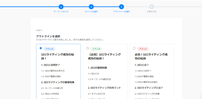 タイトルを選択すると3つの記事構成を生成してくれます。希望する記事構成に近いものを選択します。 4.記事を編集