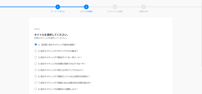 キーワードからタイトルが10つ生成されるので、好きなタイトルを選択します。 3.アウトラインを選択