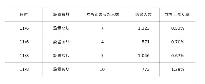 →“設置あり”は“設置なし”の約1.7倍の立ち止まり率を記録