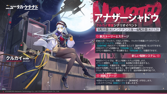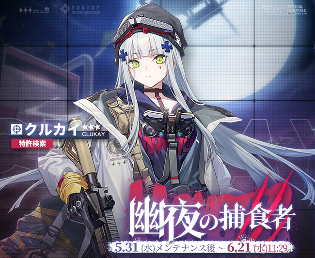 5月31日(水)メンテナンス後より、★3新人形【クルカイ(CV:野中藍)】の出現率がUPする特許検索「幽夜の捕食者」を開催します。期間限定人形【クルカイ】を手に入れましょう。
