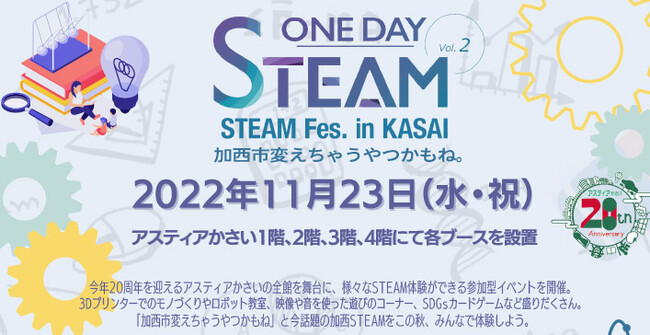 今年20周年を迎える「アスティアかさい」を舞台に、2023年11月23日(水・祝)様々なSTEAM体験ができる参加型イベント「第2回加西STEAMフェス」を開催します!